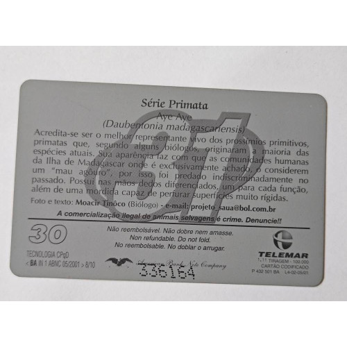 - Modelo: Cartão Telefônico TElemar - Série Primata - Aye Aye