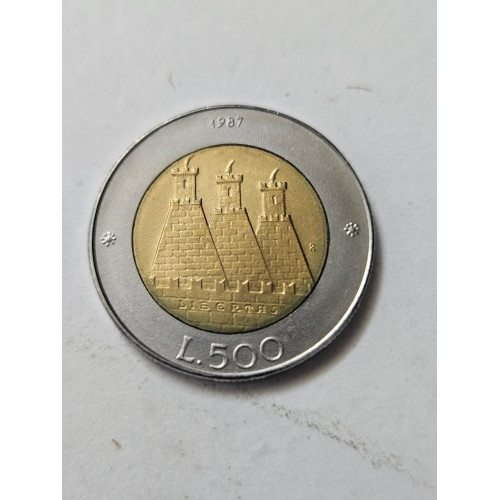 Etiquetas: Moeda, San Marino, 500 Liras, 1987, Três Torres, Três Castelos, Bimetálica, Brasão Coroado, numismática, coleção, moeda europeia, LIBERTAS
